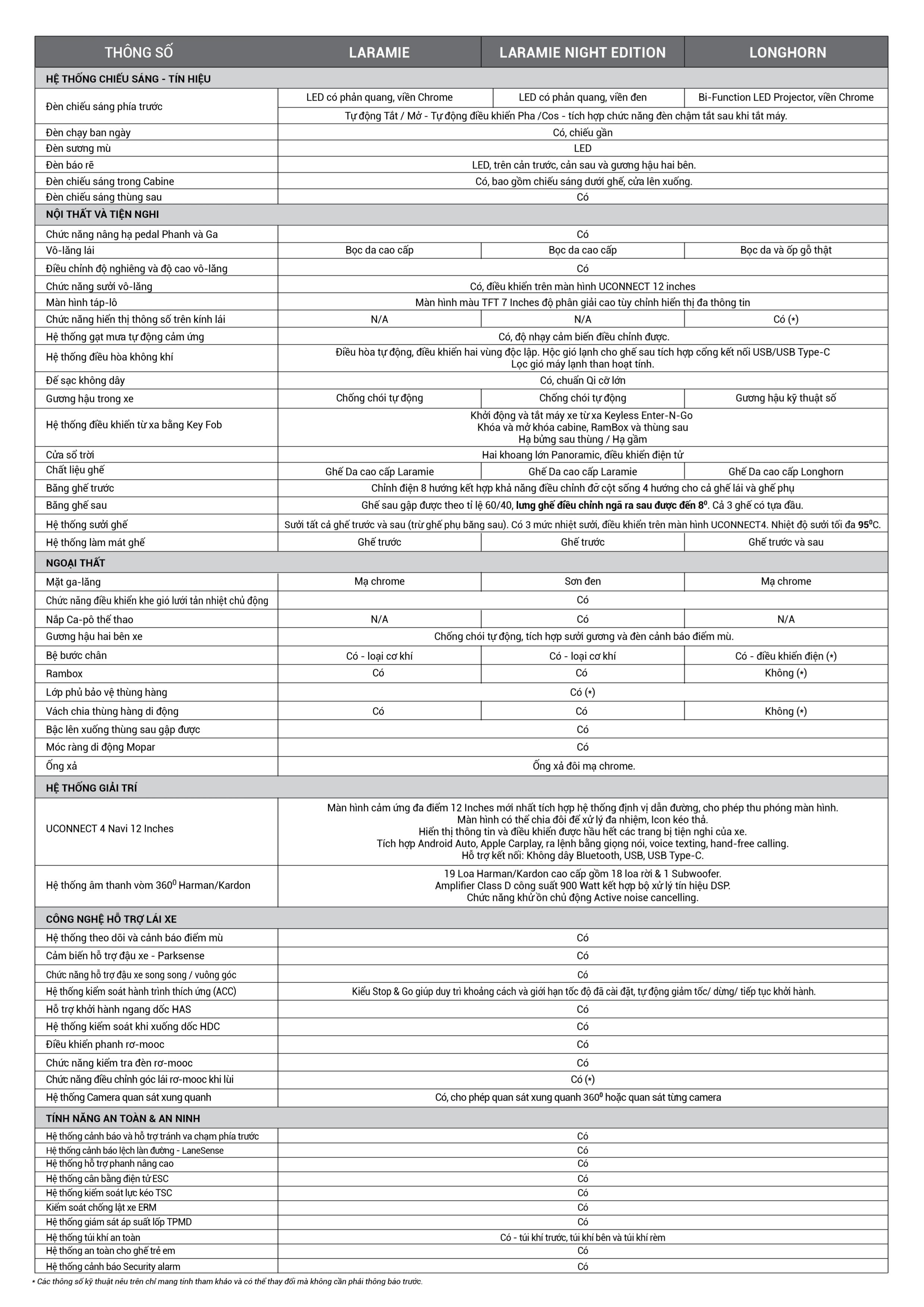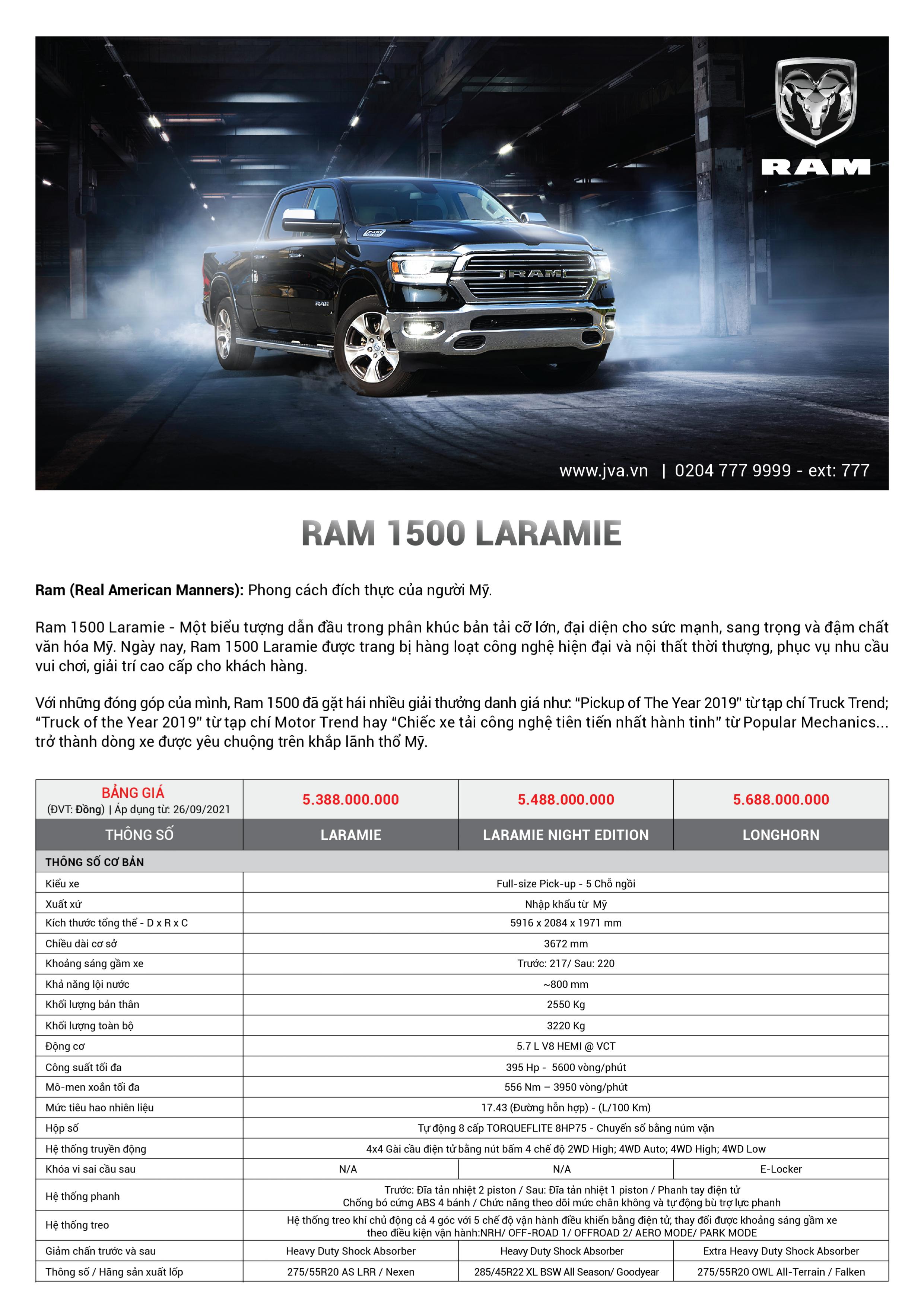 Xe RAM 1500 Laramie nhập khẩu và phân phối chính hãng tại Việt Nam dùng động cơ V8, hộp số tự động 8AT và hệ dẫn động AWD. Dung tích 5,7 lít, công suất 395 mã lực và mô-men xoắn 556 Nm giúp RAM 1500 có thể kéo vật nặng lên đến 5,7 tấn.