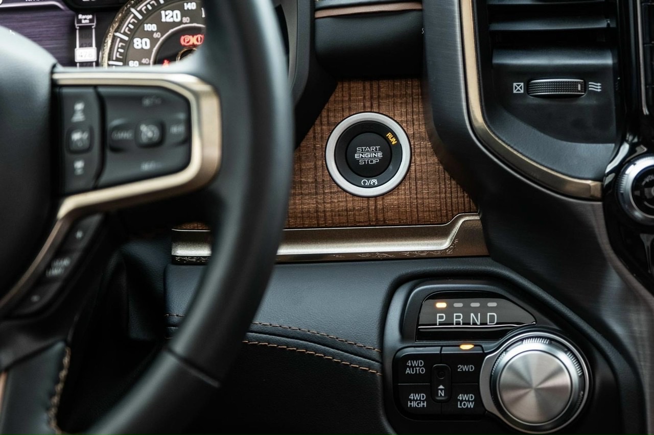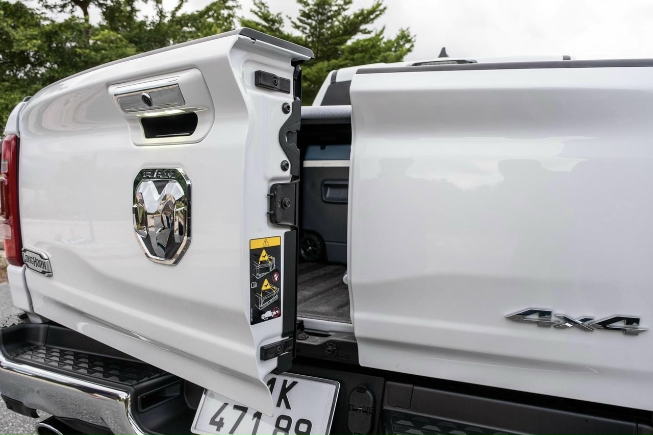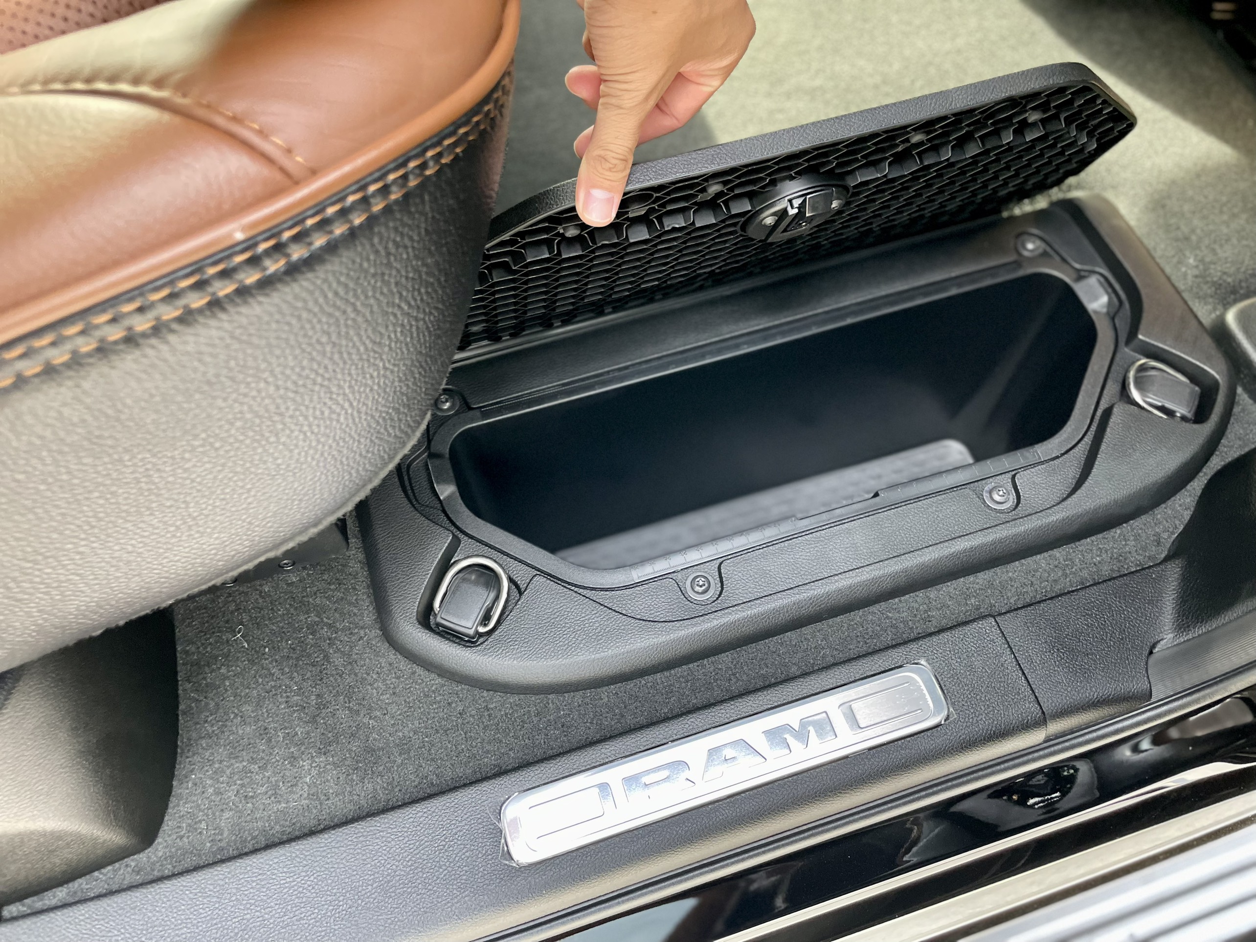 Nằm phía dưới màn hình trung tâm là một vài nút điều khiển cho chức năng kéo rơ-mooc, cảm biến đỗ xe, trong đó đáng chú ý là nút điều khiển hệ thống treo khí nén – một trang bị tùy chọn cao cấp có trên chiếc RAM Limited, cũng là một tính năng càng cho thấy chiếc bán tải này chẳng hề kém cạnh so với nhiều mẫu xe SUV sang cỡ lớn. Hệ thống gồm 4 bầu phuộc hơi nằm ở từng trục bánh dễ dàng cho phép nâng cao hay hạ thấp trọng tâm xe để thích ứng với các điều kiện lái xe khác nhau. Cũng chú ý rằng, cấu trúc treo sau của chiếc RAM này không phải dạng lá nhíp mà là cơ cấu đa liên kết (5 liên kết) cùng với thanh cân bằng, kèm phuộc hơi.