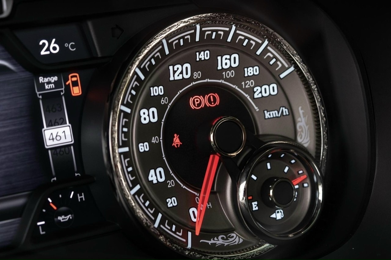 Lại một thiết kế cao cấp khác, là bố trí cụm điều khiển cần số và hệ dẫn động nằm ngay bên trái phía dưới của màn hình trung tâm. Đặc biệt, hộp số được điều khiển điện tử bằng núm xoay chứ không phải dạng cần gạt thường thấy. Bên cạnh núm xoay chuyển số này là các nút chọn chế độ dẫn động như 2WD, 4WD Auto, 4WD HIGH, 4WD LOW.