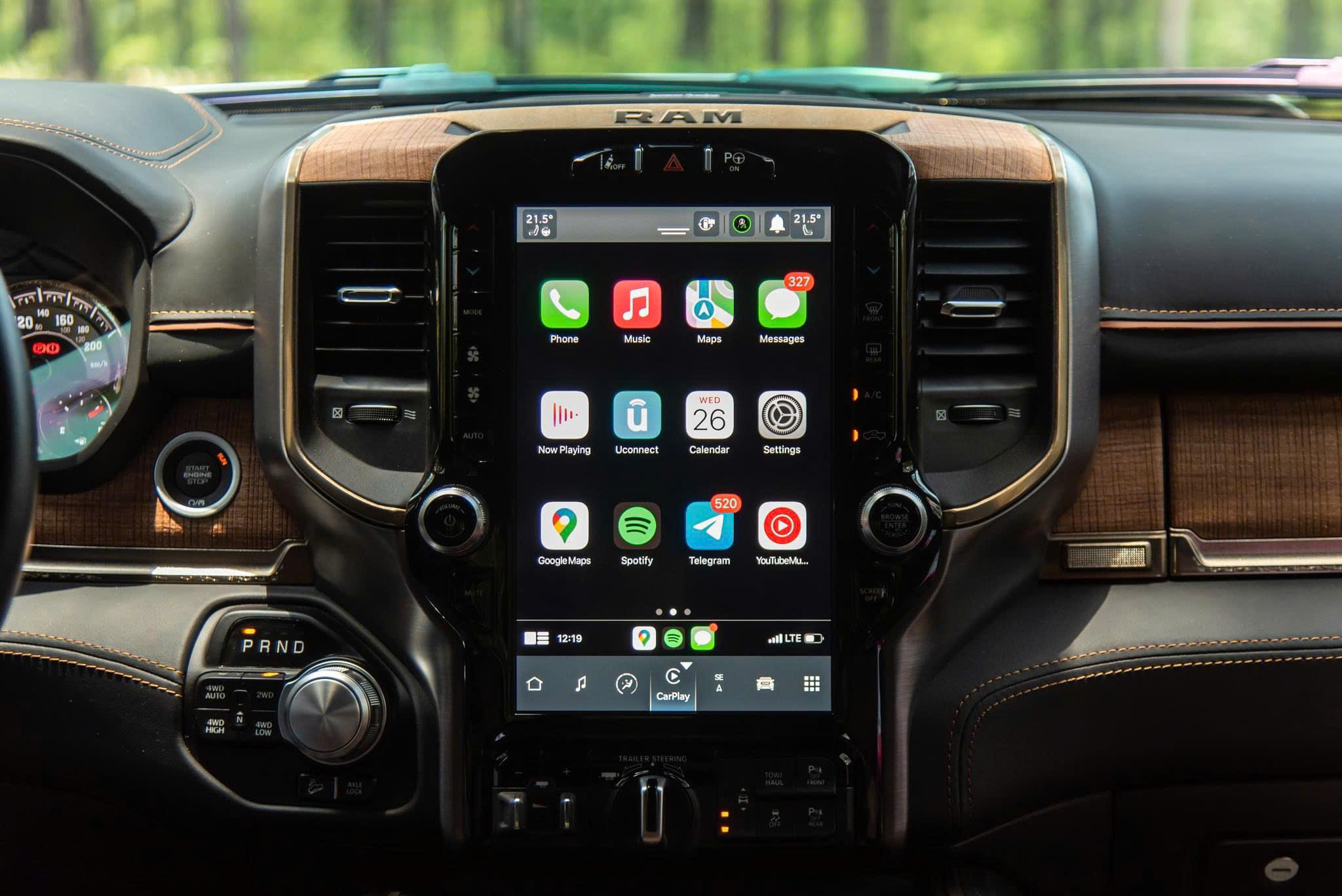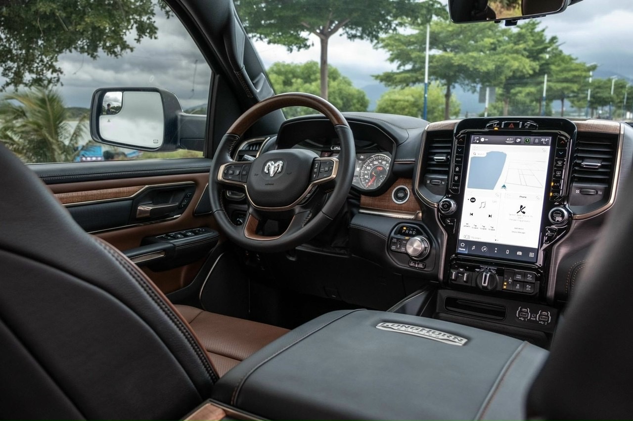 Và quả thực không hổ danh cho RAM 1500 Limited 2019 khi được báo chí Mỹ ca ngợi, bình chọn là chiếc xe sang trọng và đầy ắp công nghệ nhất trong phân hạng. Đập ngay vào mắt ở khu trung tâm là một màn hình thông tin giải trí cực lớn, điều khiển cảm ứng chạm được bố trí theo chiều thẳng đứng và có kích thước lên tới 12-inch – lớn nhất trong phân khúc. Thiết kế này làm liên tưởng đến màn hình trung tâm trên những chiếc xe điện Tesla tân tiến, hay gần đây nhất là 2 mẫu xe VinFast Lux SA2.0 và Lux A2.0.